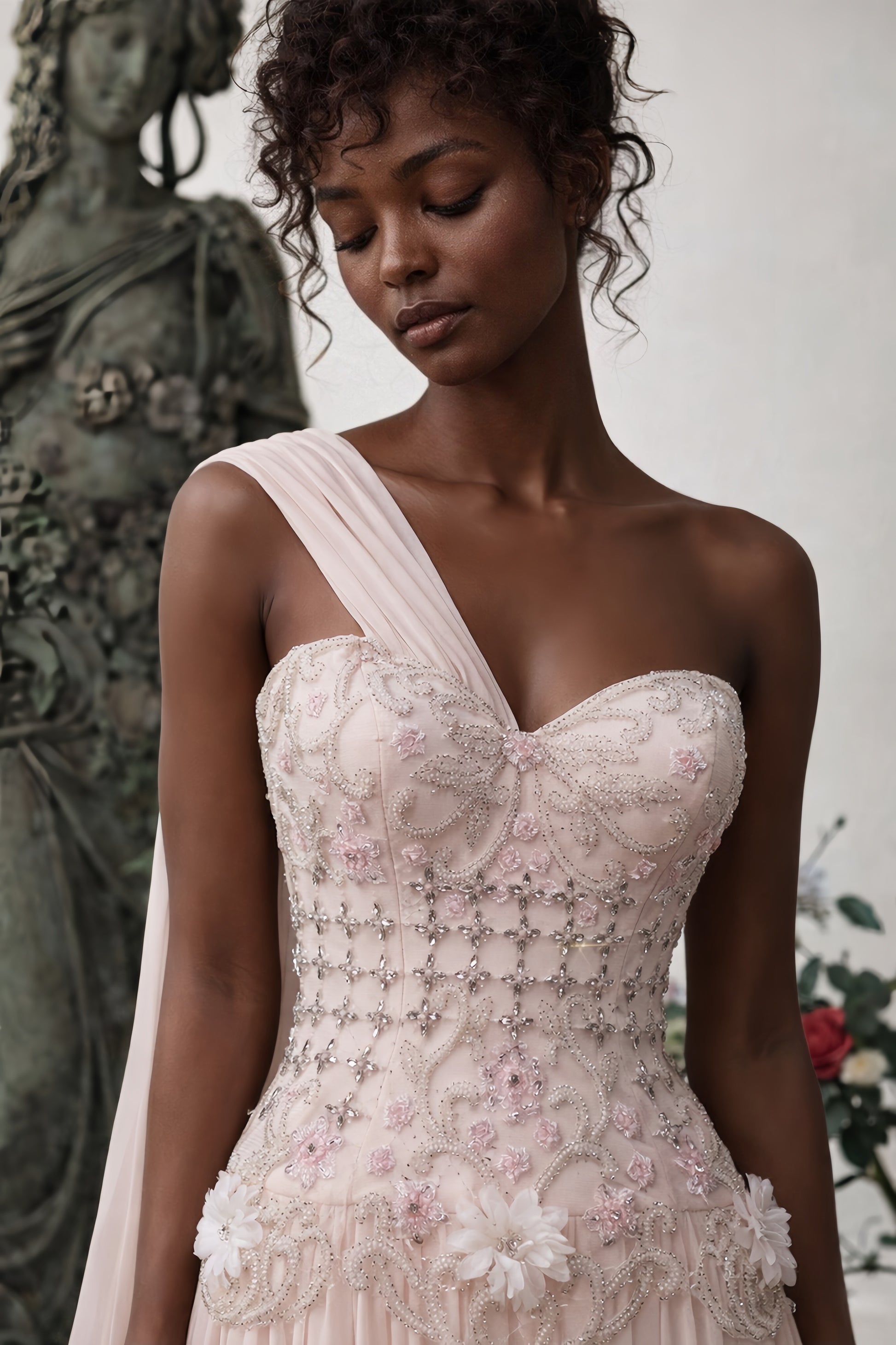 Designed with a softly structured corset bodice, Zahra is adorned with intricate embroidery and luminous embellishments that catch the light with every movement. The silhouette gently contours the waist before flowing into a graceful, airy skirt that moves effortlessly with the body.